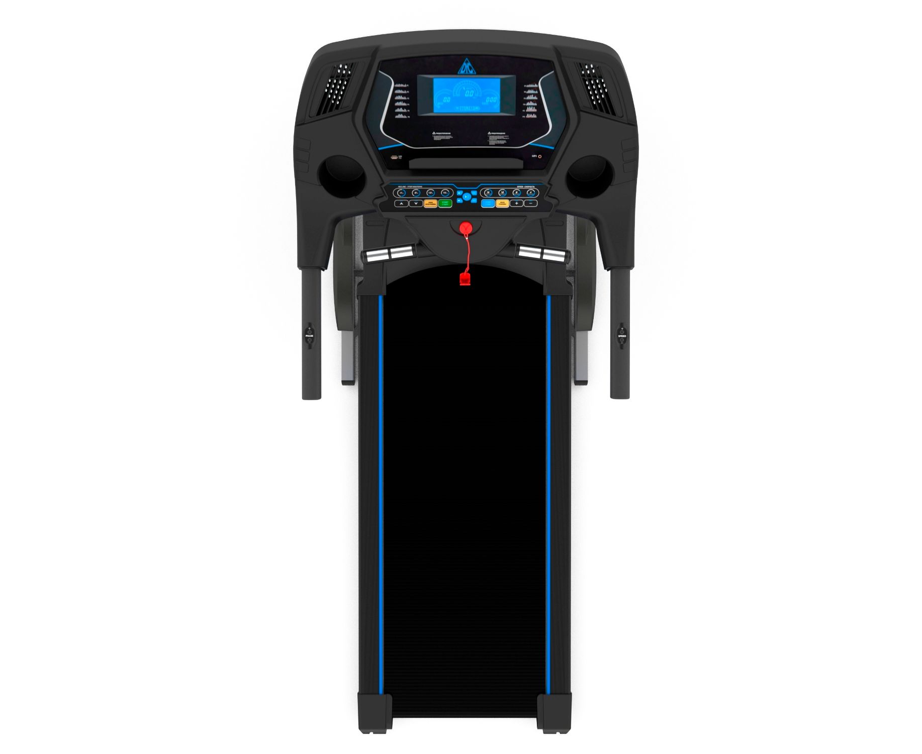 - На поручнях так же расположены "быстрые кнопки" - это кнопки запуска и остановки бегового полотна, а так же кнопки изменения скорости. Это позволяет не отрывать руки с поручней во время занятий не тренажере.