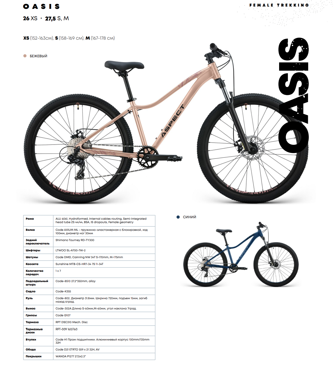 Aspect Oasis 26 (2026) создан для женщин, предпочитающих активное катание с комфортной посадкой и лёгким управлением. Лёгкая алюминиевая рама с женской геометрией и внутренней проводкой тросов подчёркивает современный стиль.Достоинства и особенности: