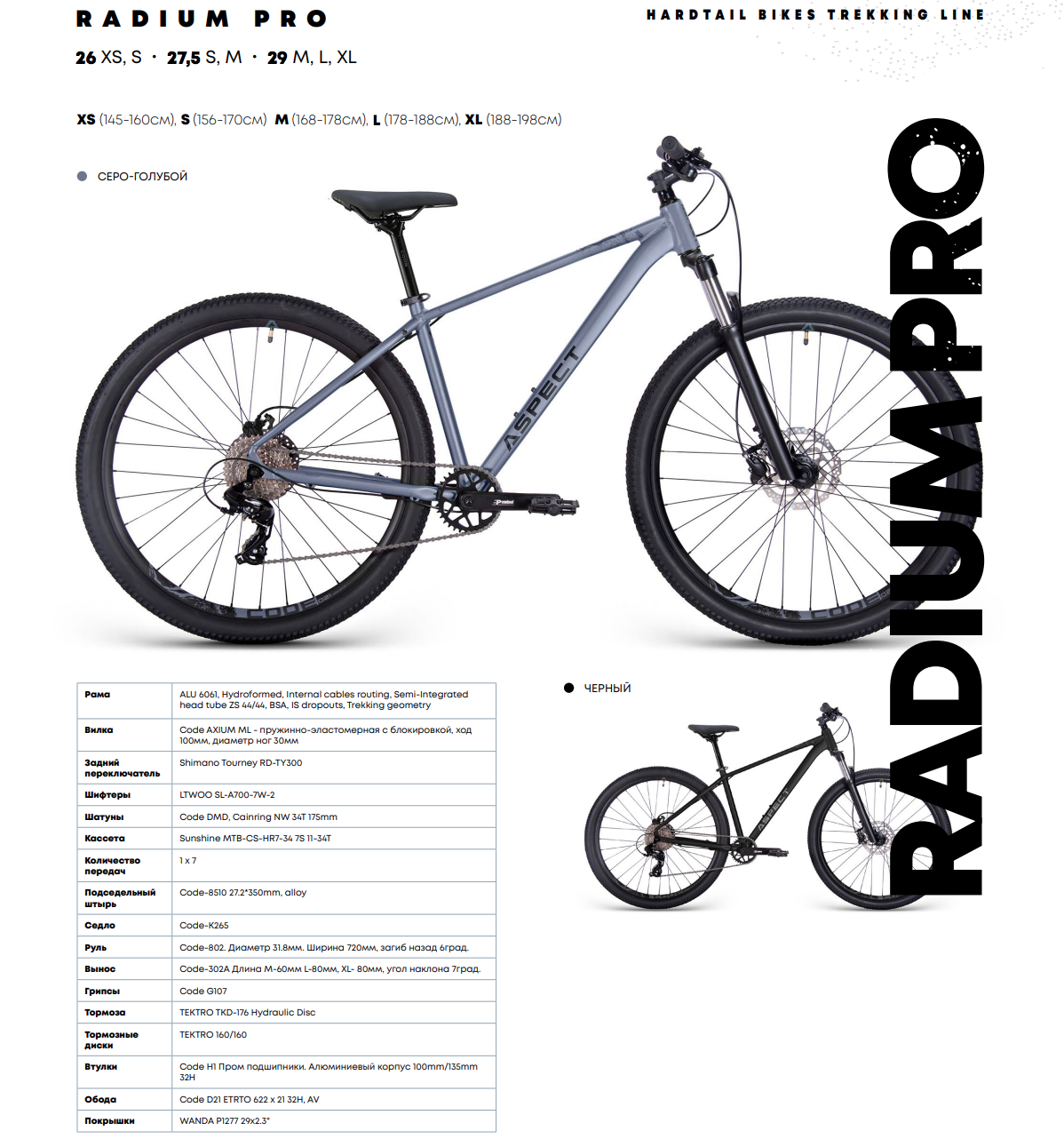 Aspect Radium Pro 27.5 (2026) – хардтейл начального уровня для треккинговых маршрутов и активного отдыха на природе. Лёгкая алюминиевая рама с внутренней прокладкой тросов и геометрией, ориентированной на комфорт при продолжительных поездках, сочетается с 27.5 - дюймовыми колёсами, придающими накатистость и устойчивость на дальних дистанциях.Достоинства и особенности: