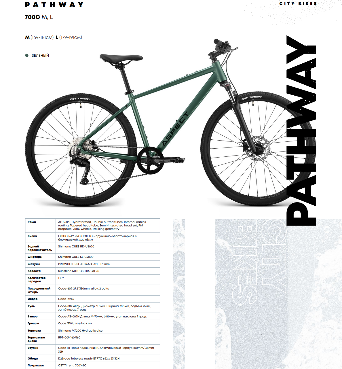 Aspect Pathway 700С (2026) — городской велосипед для динамичных поездок и долгих прогулок. Гидроформированная алюминиевая рама с треккинговой геометрией и внутренней проводкой вместе с 700C-колёсами даёт стабильный ход, аккуратный внешний вид и комфорт на ежедневных маршрутах.Достоинства и особенности модели: