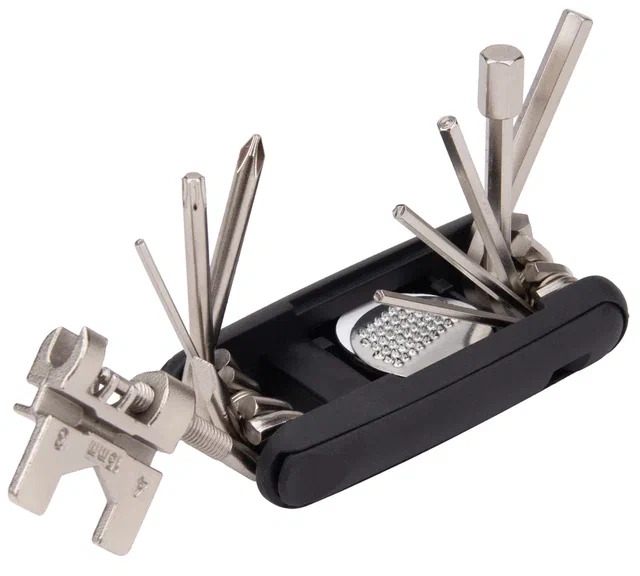 - Инструмент включает в себя семь шестигранных ключей на 2 / 2.5 / 3 / 4 / 5 / 6 / 8 мм, плоскую отвёртку, крестовую, выжимку для цепей спицной ключ и бортировочные лопатки, что делает его незаменимым помощником при каждой поездке.