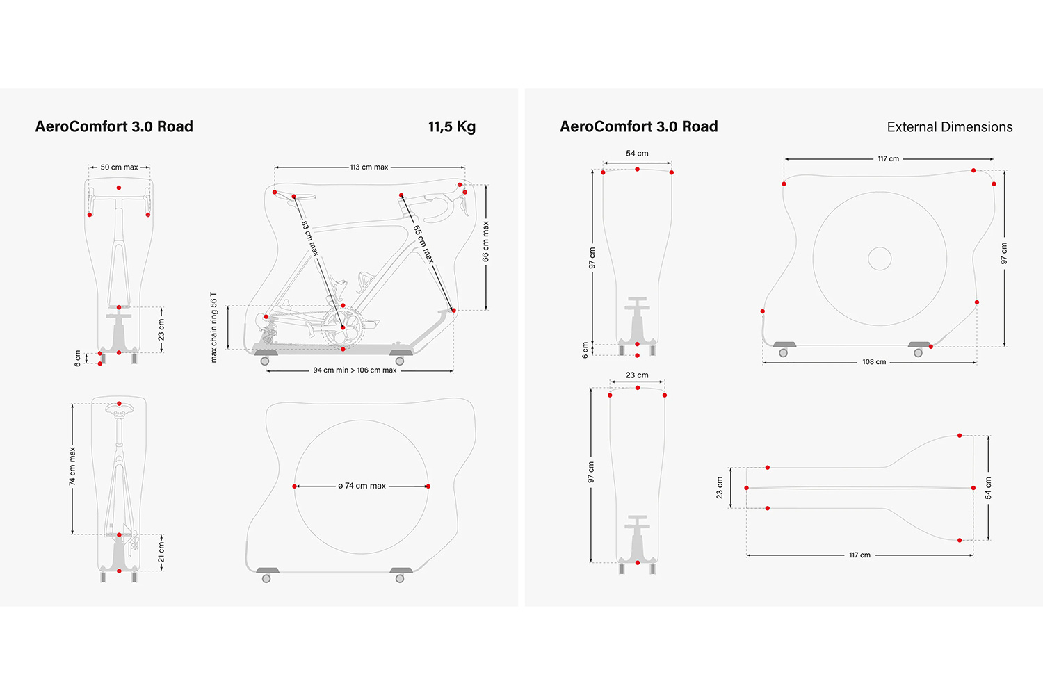 AeroComfort ROAD 3.0 TSA совместим с большинством шоссейных велосипедов ростовок XS, S, M, L, XL. Внешние размеры сумки составляют 109 х 103 х 50 см. Чтобы упаковать велосипед, требуется снять только колеса. Снимать седло, руль или ручки не нужно.