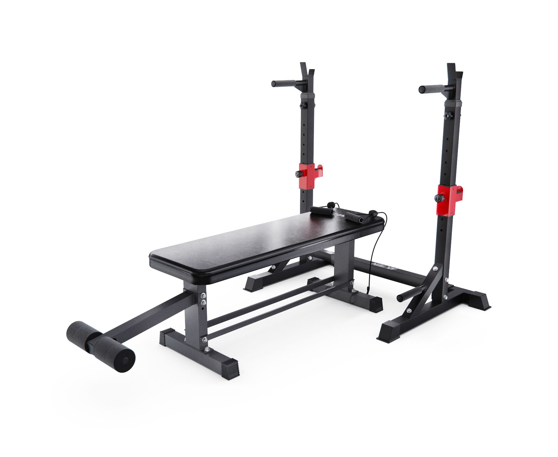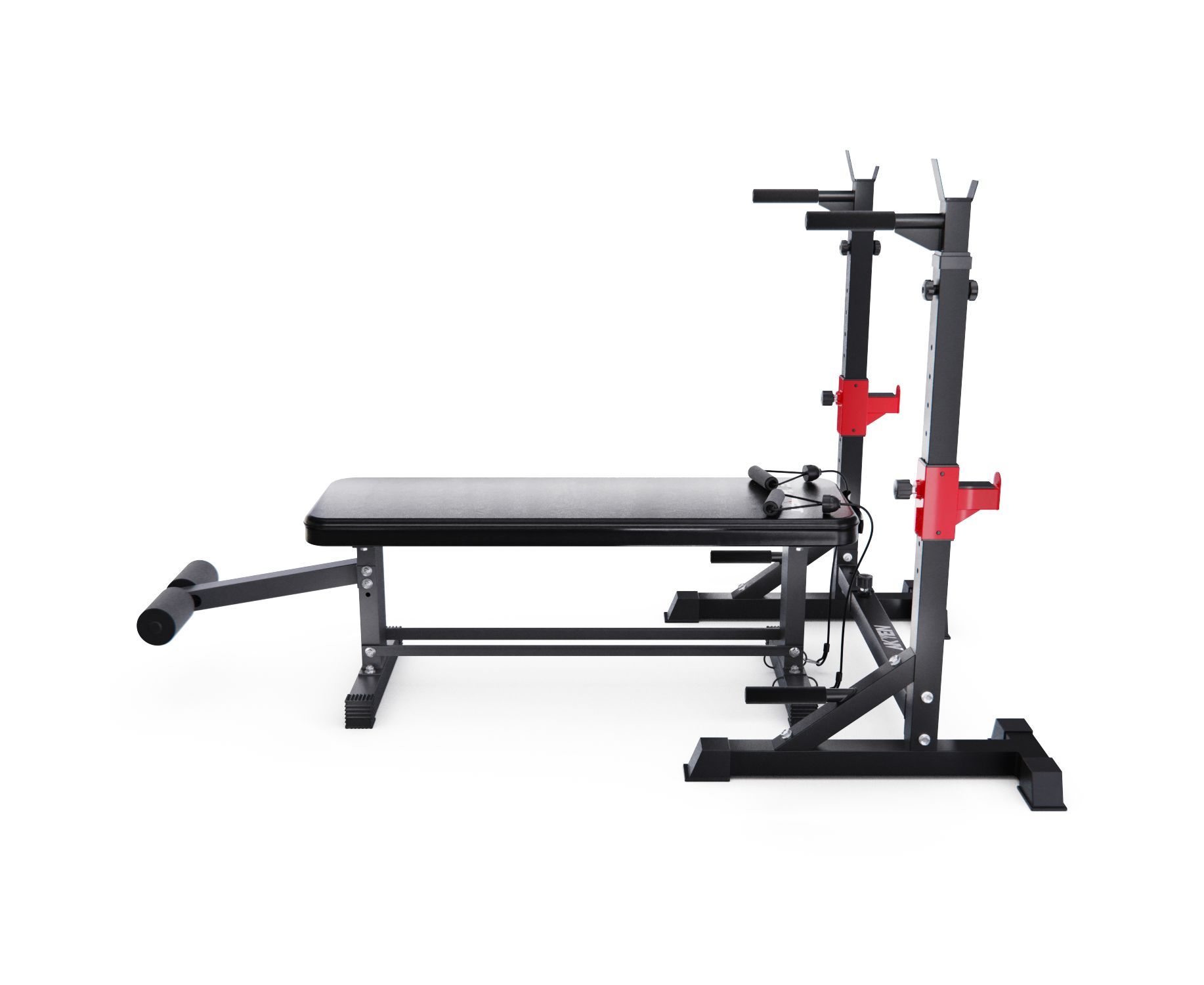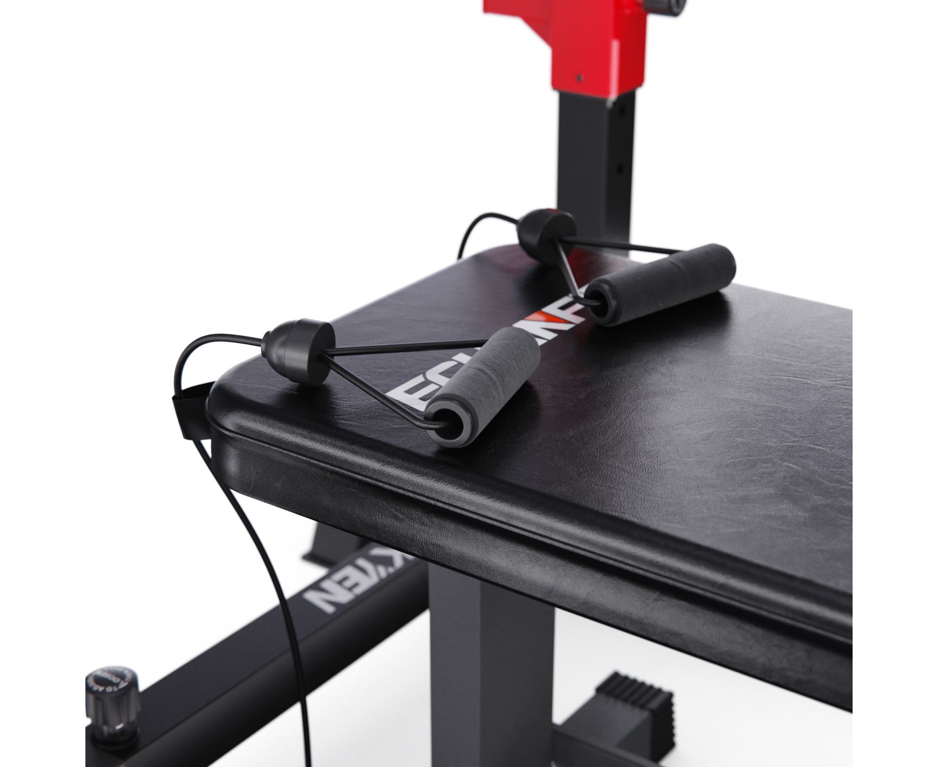 Скамья дополнительно оснащена креплениями для гантелей для удобного хранения, а также быстрого доступа к ним во время тренировки. Крепления рассчитаны на массу до 35 кг и диаметр до 20 см. Валик для ног диаметром 7,5 см и длиной 13,2 см имеет надежное крепление длиной 34 см. Эспандеры, поставляющиеся в комплекте, имеют длину 80 см служат для дополнительного укрепления мышц рук.