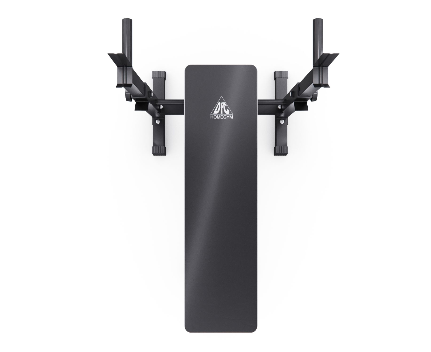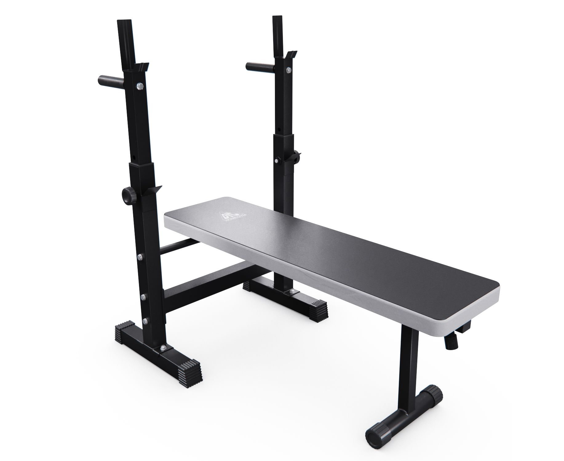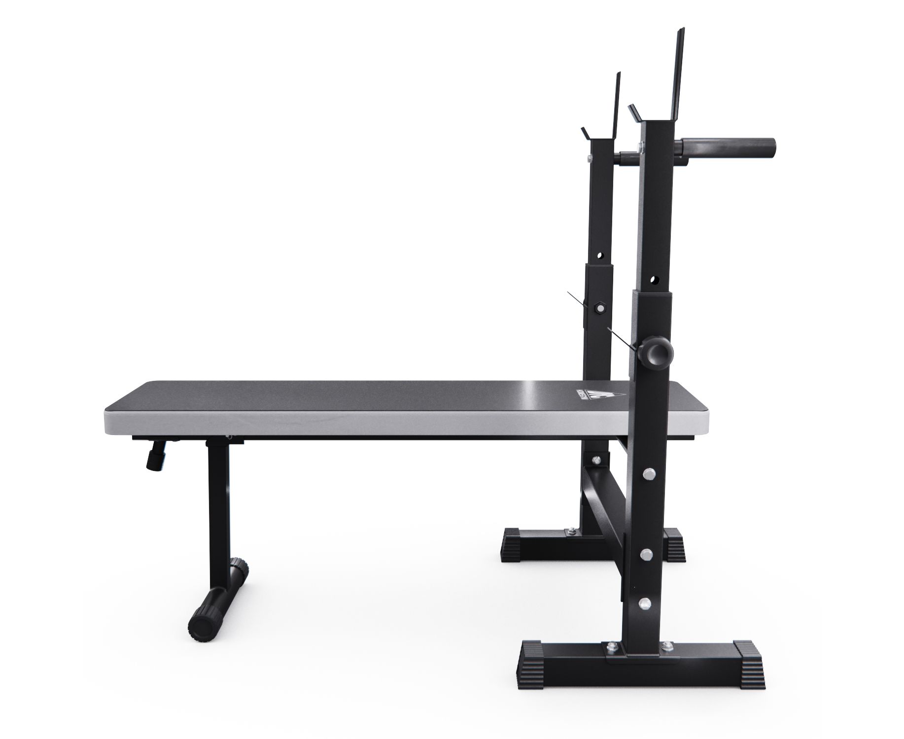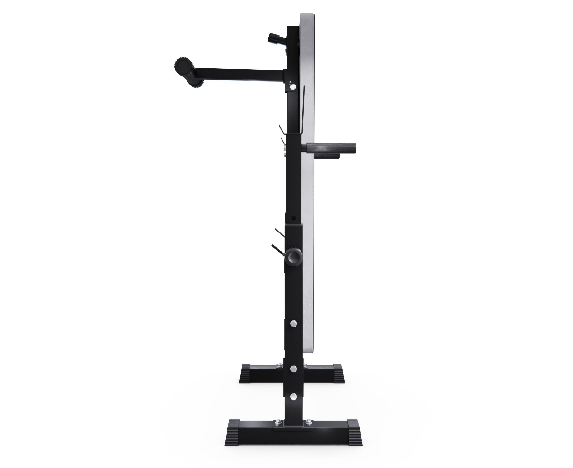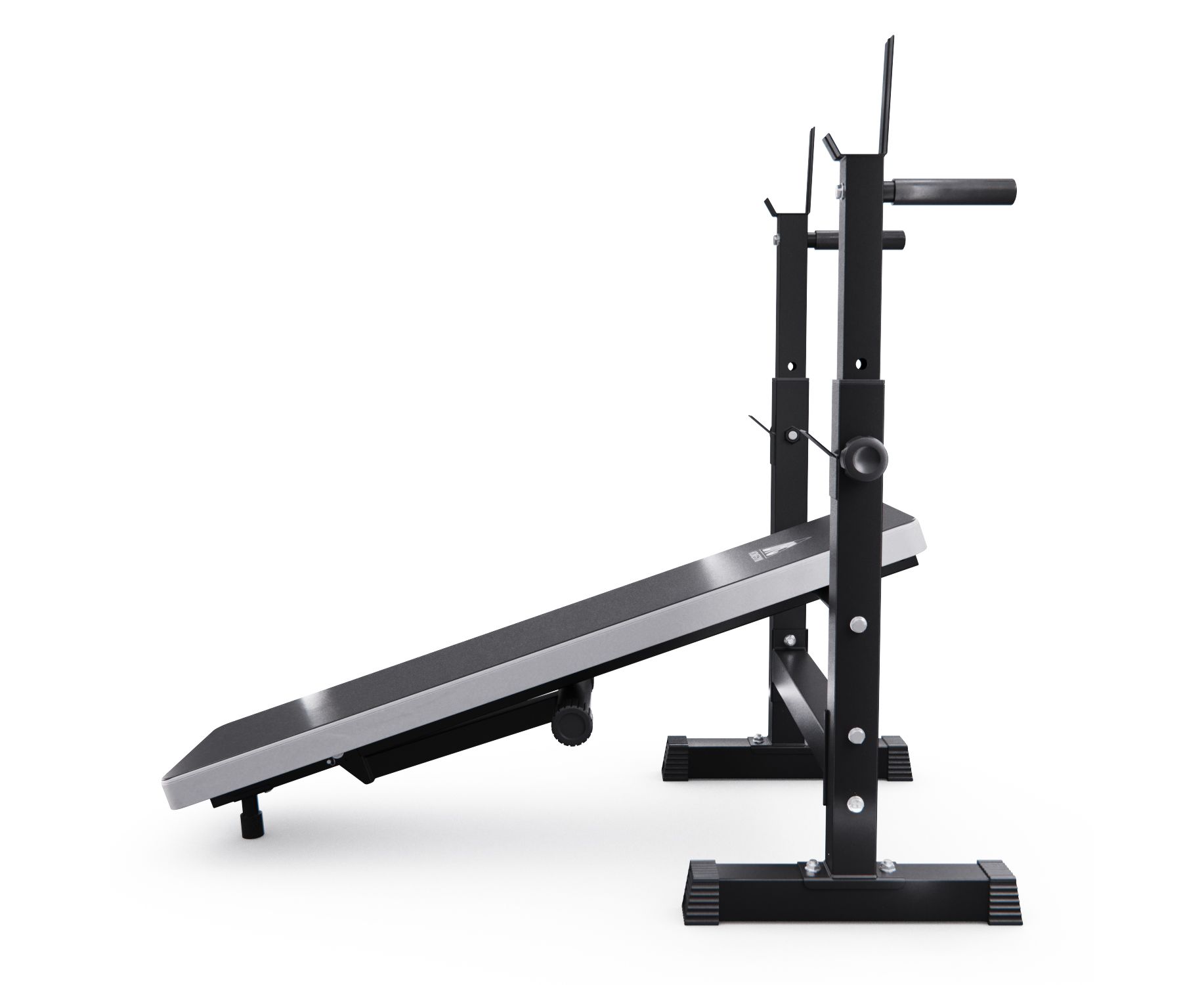 Скамья представляет собой единую складную конструкцию с основанием, обтянутым нескользящей тканью благородного серого цвета. У изголовья расположены две стойки с регулируемой высотой и двумя держателями. Верхний держатель штанги имеет ширину 62,5 см. Максимальная нагрузка на верхний держатель — 120 кг, на нижний — 100 кг. На задней части стоек есть ручки для упражнений на руки. На ножках имеются противоскользящие валики и компенсаторы неровности пола.