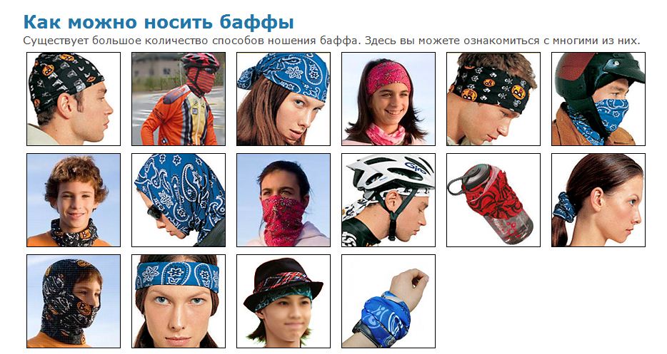 - Надевают такую бандану на голову во время занятий спортом, при отдыхе летом на пляже или на шею при езде на мотоцикле или велосипеде.