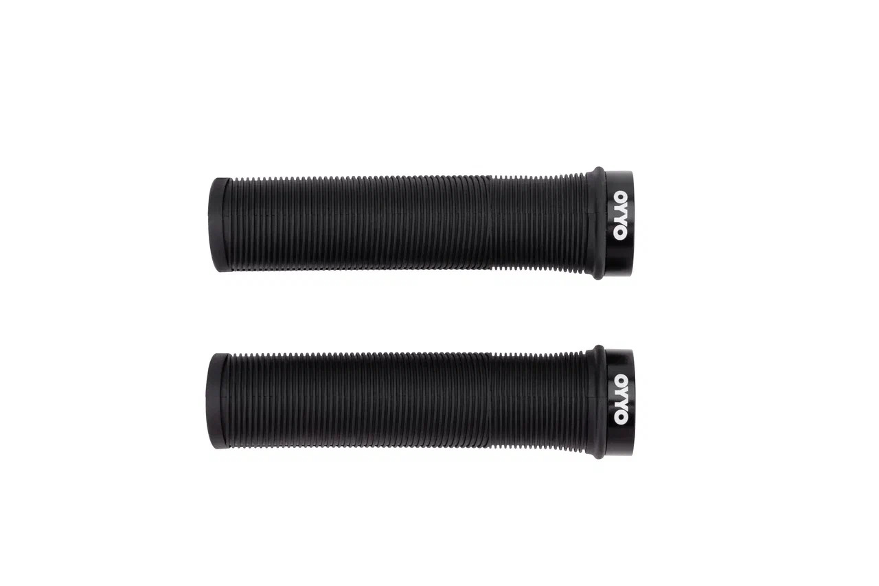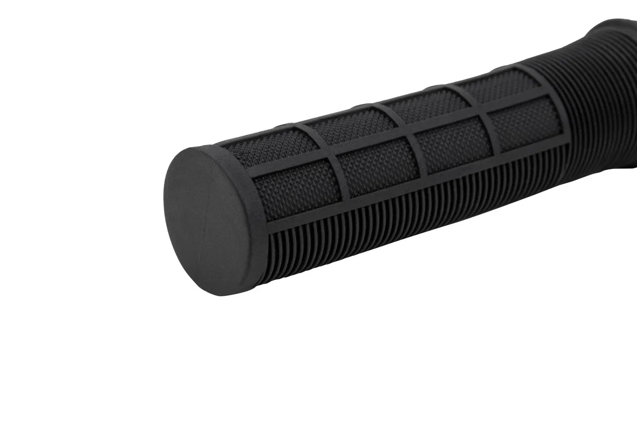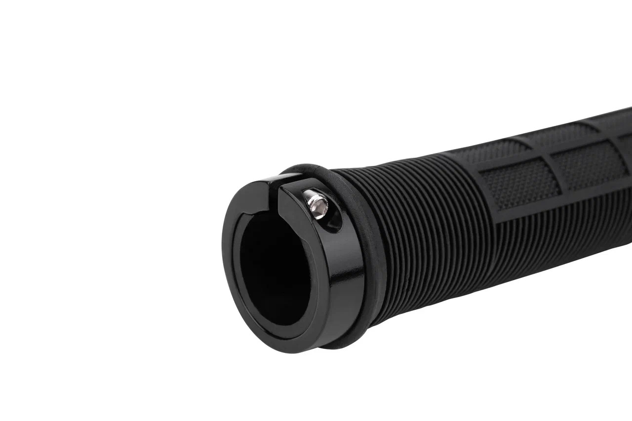 Благодаря продуманной структуре они обеспечивают отличное сцепление с ладонью и эффективно амортизируют неровности дороги. Крепятся на руль с помощью одностороннего стопорного кольца с винтов, изготовленного из алюминия (под руль Ø22,2 мм). В комплект также входят две пластиковые заглушки. Длина ручек - 130 мм.